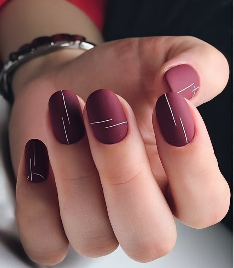 Made of this matte burgundy, this set is the dream nail minimalists live in. A velvet-like base provides the moody warmth, and a delicacy of fine white lines adds enough geometry not to get boring. It is discreet posh on the nails it is like having your life sorted in nail polish.