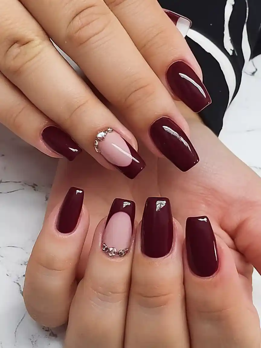 This look is better placed in acrylics or naturally powerfull nails, it is designed of a square long form. The jewels of the bottom give it just the right amount of drama that is not impractical. In case you are a fan of burgundy nails and want a design with a wink of class, this style has it all.