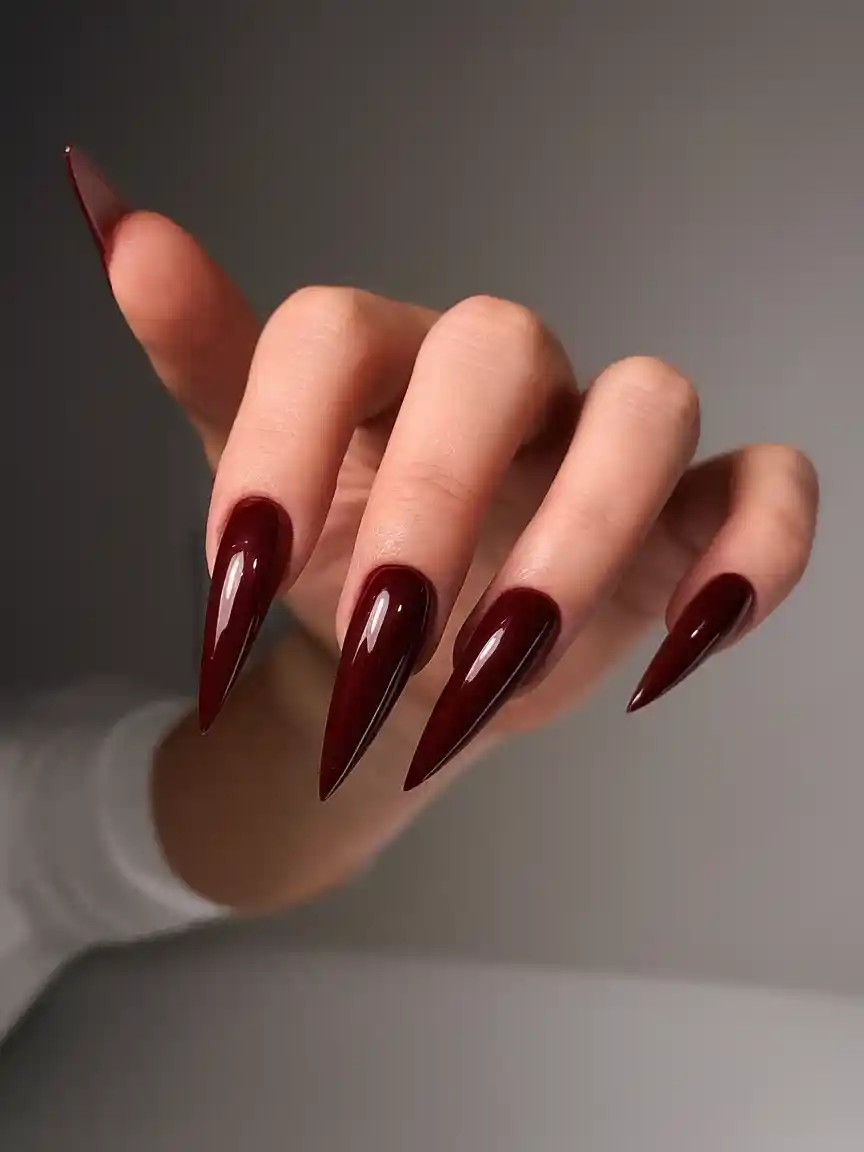 These pointed stiletto nails are nothing short of fierce. They are painted glossy burgundy to shout sophistication with an edge and are designed for the woman who walks into a room and dominates it. Nothing extra is required, the pointed design and strong polish do the rest of the talking.