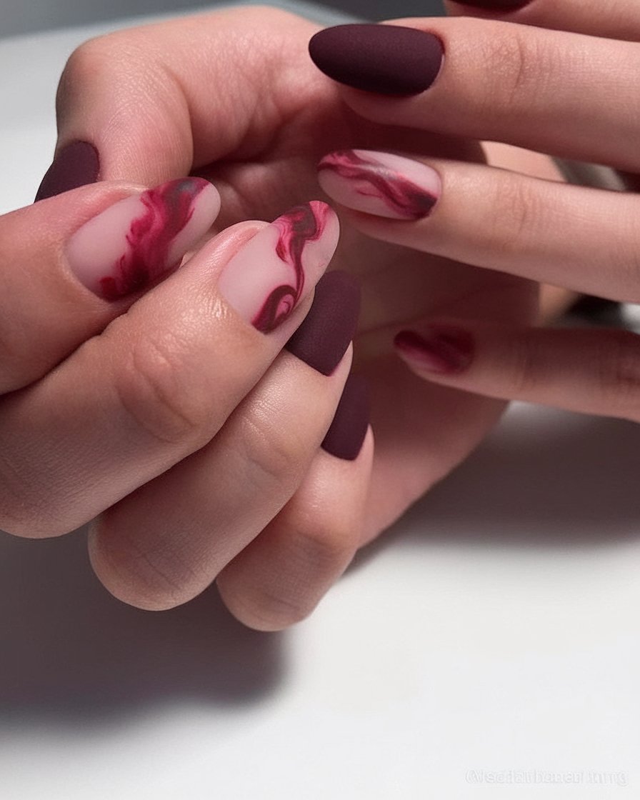 This Inspo design resembles burgundy smoke blowing on the matte sky. Abstract marble art pieces are painted on two nails in translucent nude and wine colours, whereas the other ones remain matte and earthly. It looks like something arty that does not over do it to the point of being ridiculous, the manicure version of having an abstract picture in your living room.