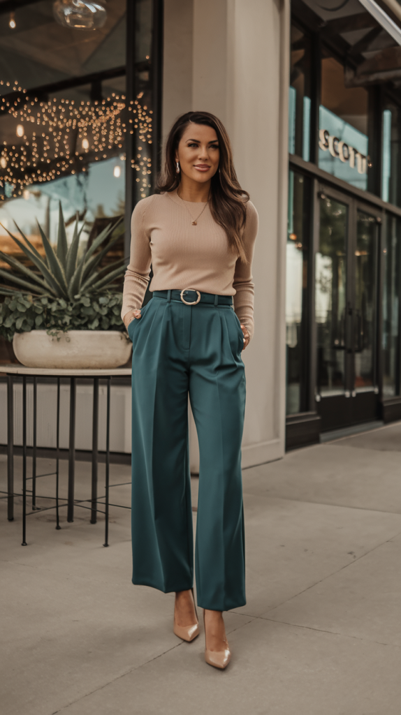 A fitted beige sweater paired with high-waisted emerald green trousers creates a standout business casual for women look. The rich green tone adds a pop of color to the neutral top, making it suitable for any season, from chilly autumn days to springtime refresh.