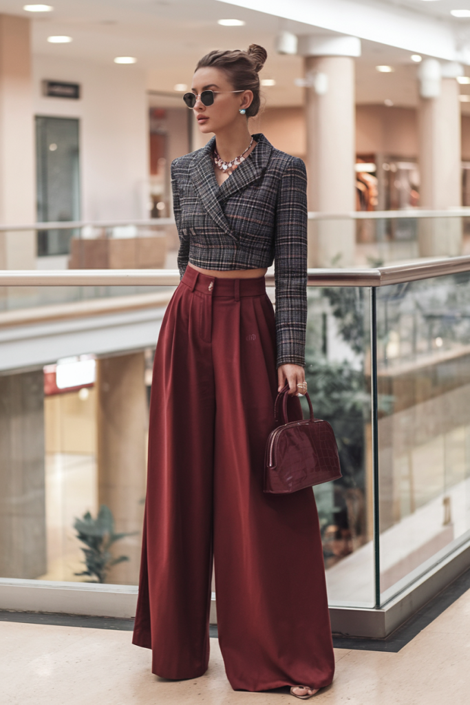 A cropped plaid blazer with high-waisted burgundy wide-leg pants offers a trendy twist on traditional office attire. The combination of tailored structure and bold color makes this outfit versatile across seasons, especially in autumn and winter.