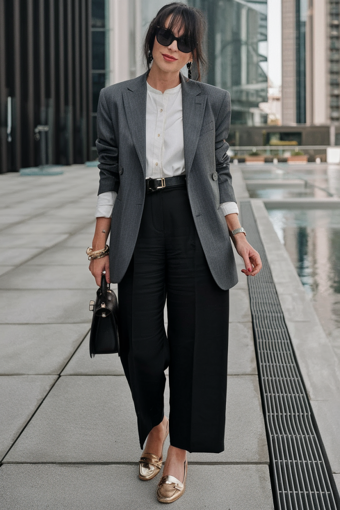 A grey oversized blazer layered over a white button-down shirt and black wide-leg trousers epitomizes the stylish yet simple appeal of business casual for women in 2025. This outfit is perfect for work, offering a structured look without sacrificing comfort.