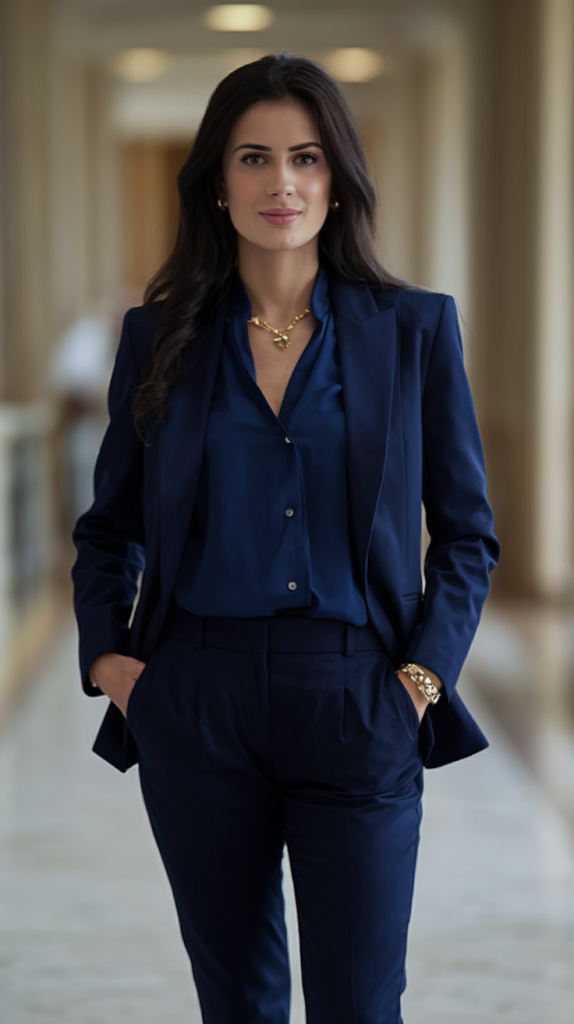 A navy suit worn with a silk blouse adds an element of understated luxury to the business casual for women wardrobe. The fluidity of the silk complements the tailored suit, making it perfect for interview, client meetings, or daily work wear.