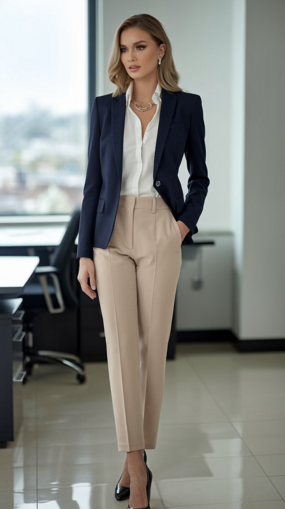 A navy blazer over a white blouse and beige tailored trousers offers a classic business casual look that works in any season, from spring to winter. This ensemble is both simple and stylish, making it a must-have for women work wardrobes.