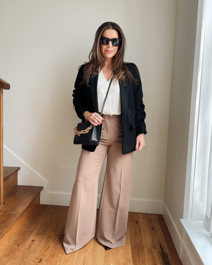 A black blazer is an essential piece for any business casual outfit for women, and this ensemble shows why. The tailored fit of the blazer offers a structured silhouette, perfectly balanced by wide-leg beige trousers that bring a relaxed yet classy aesthetic to the workplace. Paired with a white blouse, the outfit is effortlessly stylish and versatile, making it suitable for various occasions, from an interview to a client meeting. The gold chain detail on the black crossbody bag adds a touch of sophistication, making it ideal for women work settings.