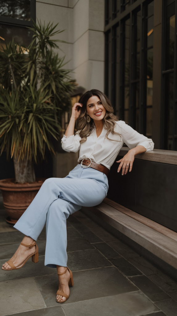 This ensemble blends a crisp white blouse with pastel blue high-waisted trousers, creating a look that is both cute and professional. The cinched waist with a statement belt highlights the figure, while the relaxed fit of the trousers adds comfort, making it an ideal choice for work during summer or spring. This outfit speaks to women who prefer a simple yet polished look.