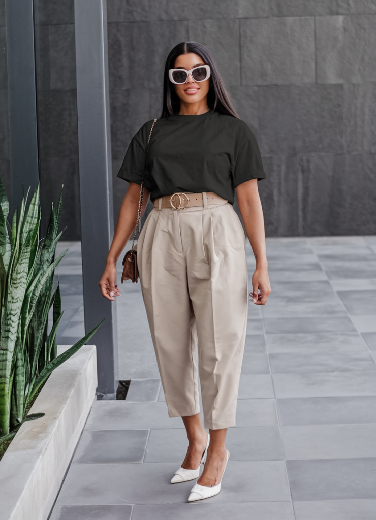 A modern twist on business casual for women, this outfit features cropped beige trousers paired with a black tee, effortlessly bridging the gap between casual and professional. The oversized belt adds a bold statement, and the structured fit of the trousers ensures the outfit remains office-appropriate. This is an excellent choice for a summer workday when comfort and style are both priorities.