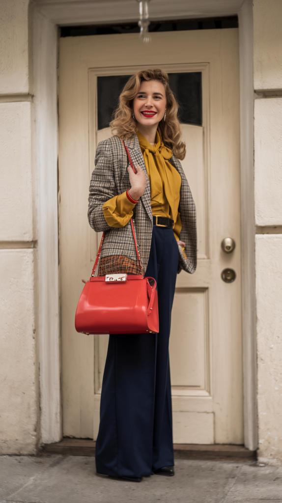This vibrant outfit brings a pop of color to business casual outfits for women, featuring a mustard blouse paired with navy wide-leg pants. The plaid blazer adds a touch of vintage charm, while the bold red handbag makes a statement. This ensemble is perfect for making an impression at an interview or work event.