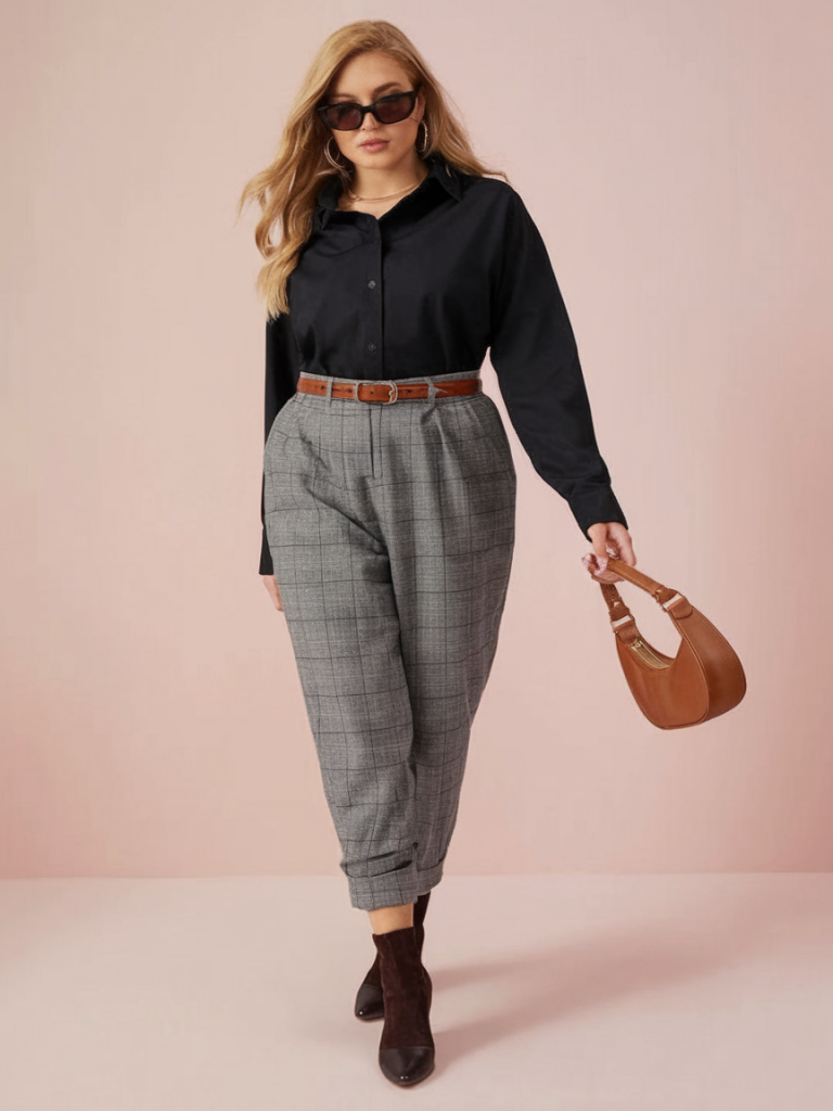 A black button-up shirt tucked into high-waisted checkered trousers creates an edgy, modern look for women at work. The brown belt adds a warm contrast, and ankle boots complete this trendy outfit, making it a go-to for autumn and winter seasons.