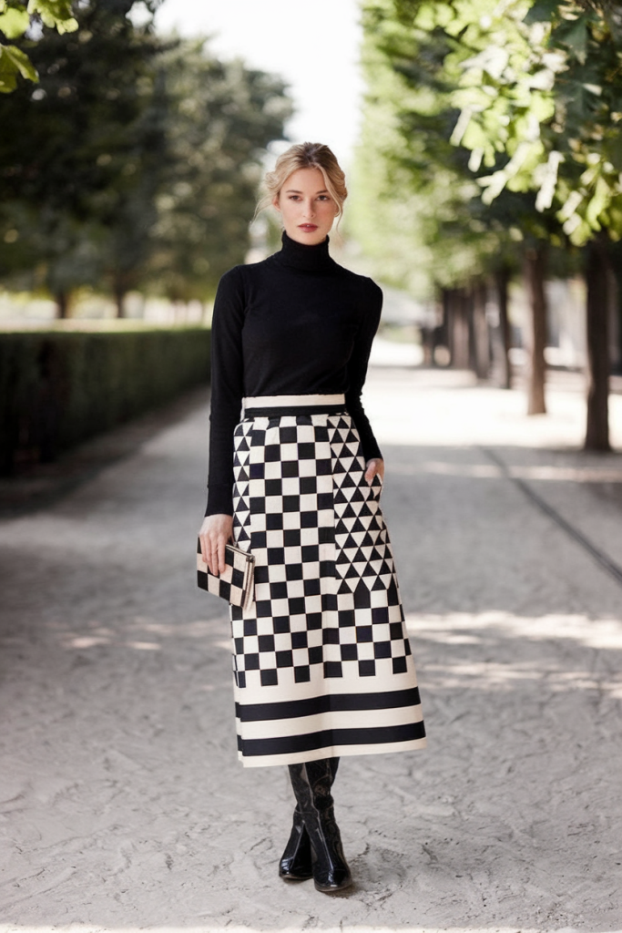 A black turtleneck paired with a high-waisted graphic midi skirt offers a unique mix of minimalism and boldness. This outfit is perfect for work and seamlessly transitions from meetings to after-hours events. The skirt’s geometric design adds a trendy touch, making it stand out in any office setting.