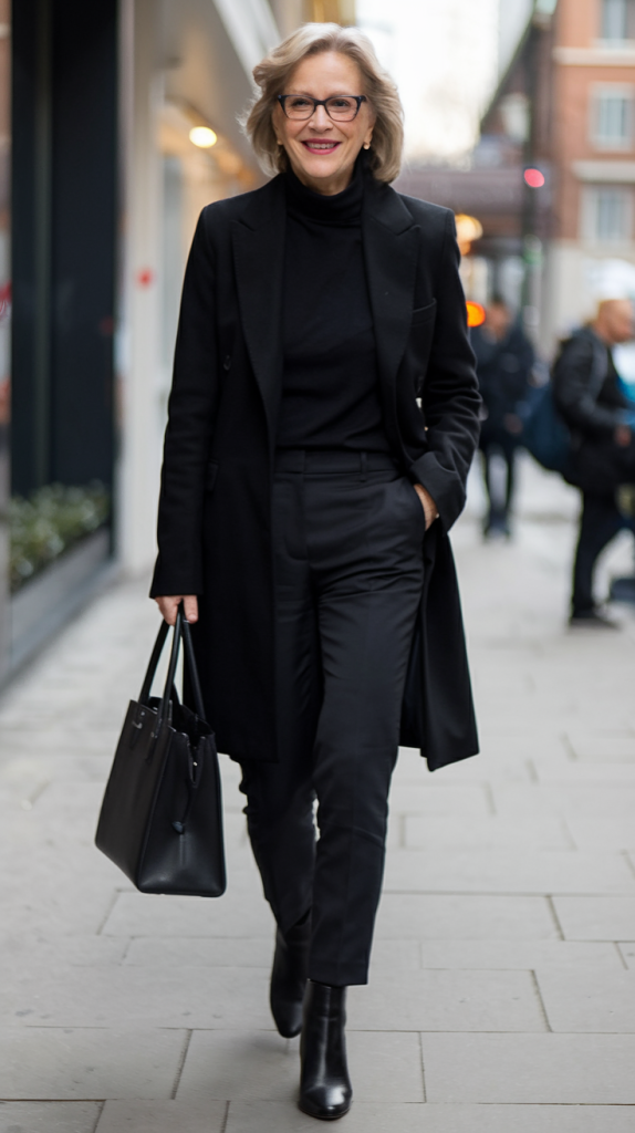 An all-black outfit featuring a turtleneck, tailored trousers, and a long coat is both timeless and modern. Ideal for women winter, this ensemble offers warmth and style, making it a top pick for cold-weather work days.