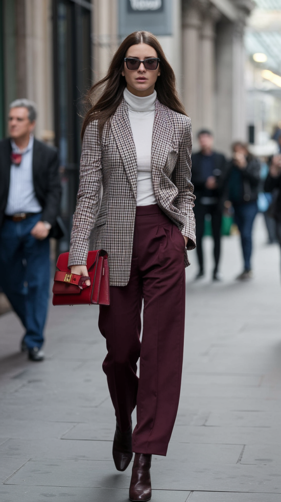 A plaid blazer over a white turtleneck paired with burgundy wide-leg trousers offers a chic, layered look perfect for winter and autumn. This ensemble reflects a polished aesthetic that is both trendy and comfortable.