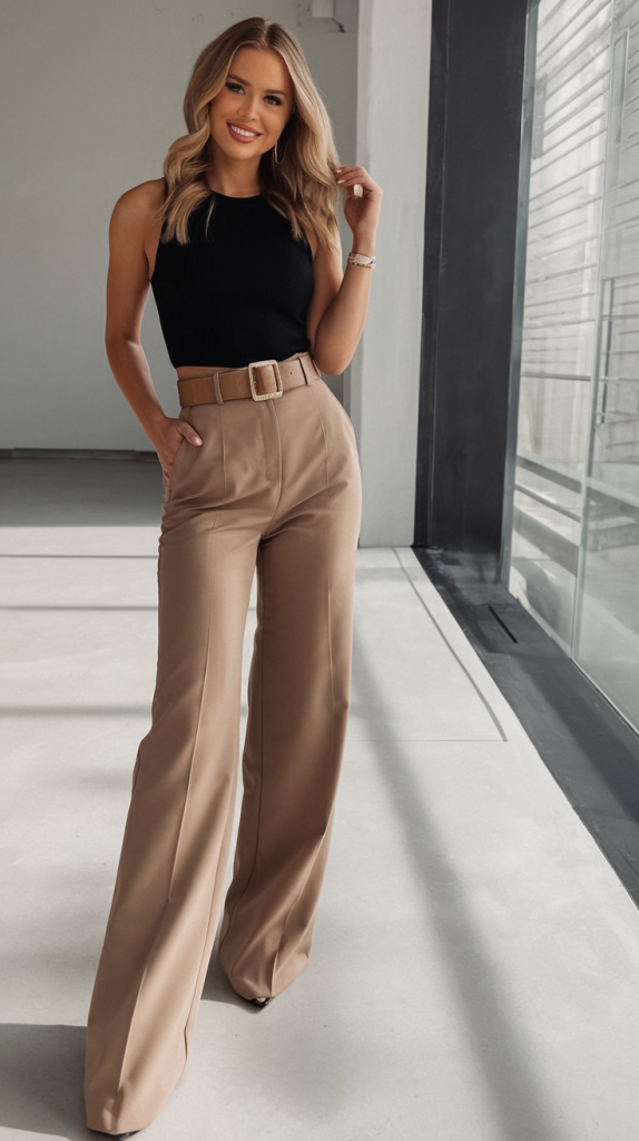 A black sleeveless top tucked into beige wide-leg trousers with a statement belt embodies the essence of business casual for women work in 2025. The simplicity of the black top contrasts beautifully with the tailored trousers, offering a look that is both stylish and simple. The lightweight fabric is perfect for summer, ensuring comfort during long office hours while maintaining a polished aesthetic.