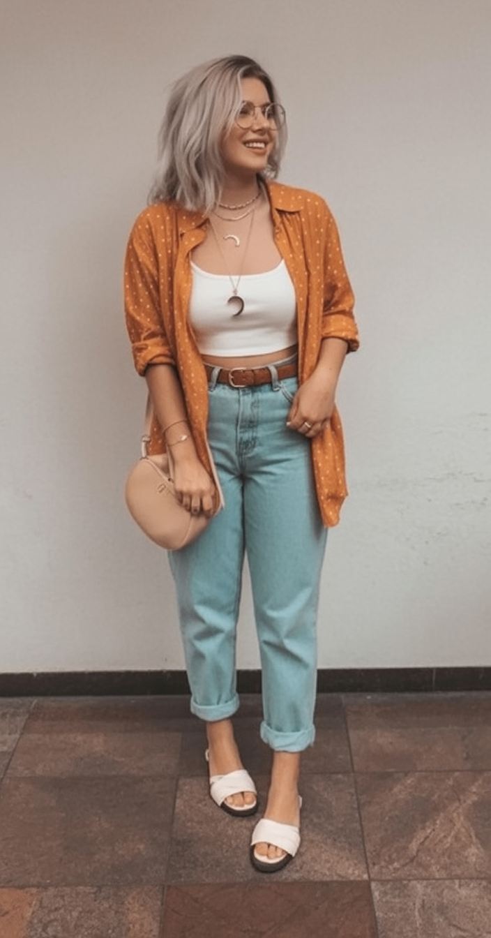 This outfit has all the warmth and color of fall sunshine captured in garment form. The open-front rust shirt over your white crop top is still very relaxed and thoughtful, especially with your faded jeans and belt. Such an outfit can go from coffee date to home office with utmost ease, and it’s totally apt at capturing the 2026 spirit of fall, which is all about style with ease and comfort. The accessories and bag are so subtle and delicate that you don’t really feel anything but light and female. Open-neck button-down shirts over crops are all over fashion trends at the moment, and it’s easy to understand why—it’s very easy to get right and works well with all fashion trends. This orange color goes well with the outfit and makes it evergreen, including summer with peep toes and fall with ankle boots and cardigans over them. It looks even more relaxed with rolled-up sleeves and works well with its cropped style. This can be an easy makeover if you get tired of plain tees but are not ready to take business blazers into fashion.