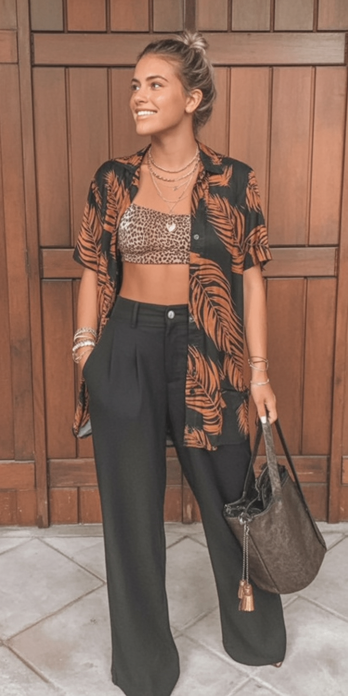 This set of clothes has that tropical and rested vibe, and you can totally get it right if you’re heading to Target, assuming you’re going somewhere tropical. This compilation of clothing, blending your tropical shirt with your leopard crop top, is one confident and perfect blending and mixing, something Casual Outfits 2026 are all about—perfectly unexpected and totally works! The dark and tailored pants keep you so smart and composed; it doesn’t really look like you woke up and got dressed, right? The set exudes fun, playfulness, and, to some degree, rebelliousness, but all in all, it’s incredible!