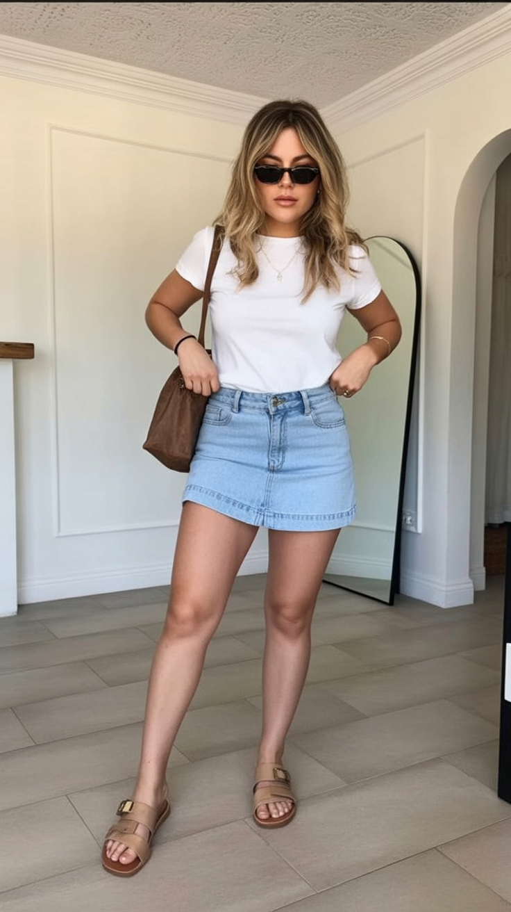 Some fashion combinations are evergreen, and this one exudes pure summer sass and attitude. Paired with this white tee, tucked under a light blue mini denim skirt, you will instantly get an evergreen, young, and fresh fashion statement without overdoing anything. The tan color of slippers and shoulder bag goes well with your outfit and makes your wardrobe evergreen, and dark shades will make you all attitude and sass. This is one of those Casual Outfits 2026, and this outfit allows your tan, your smile, and your attitude and persona to speak louder. The emotional value you get from this one is massive—just slip into these easy pieces, and suddenly you’re feeling so much lighter, so much more carefree, and ready to take on anything from school pickup to dinner plans and more. The high waist of this skirt gives definition to your figure by hugging your hips at their slimmest points, and with its subtle A-line silhouette, you’ve got perfect freedom of movement. All you need to add if you wish to bring in some dressing-up aspects would be either a necklace or some earrings, but trust me, this outfit already exudes quiet sophistication by itself.