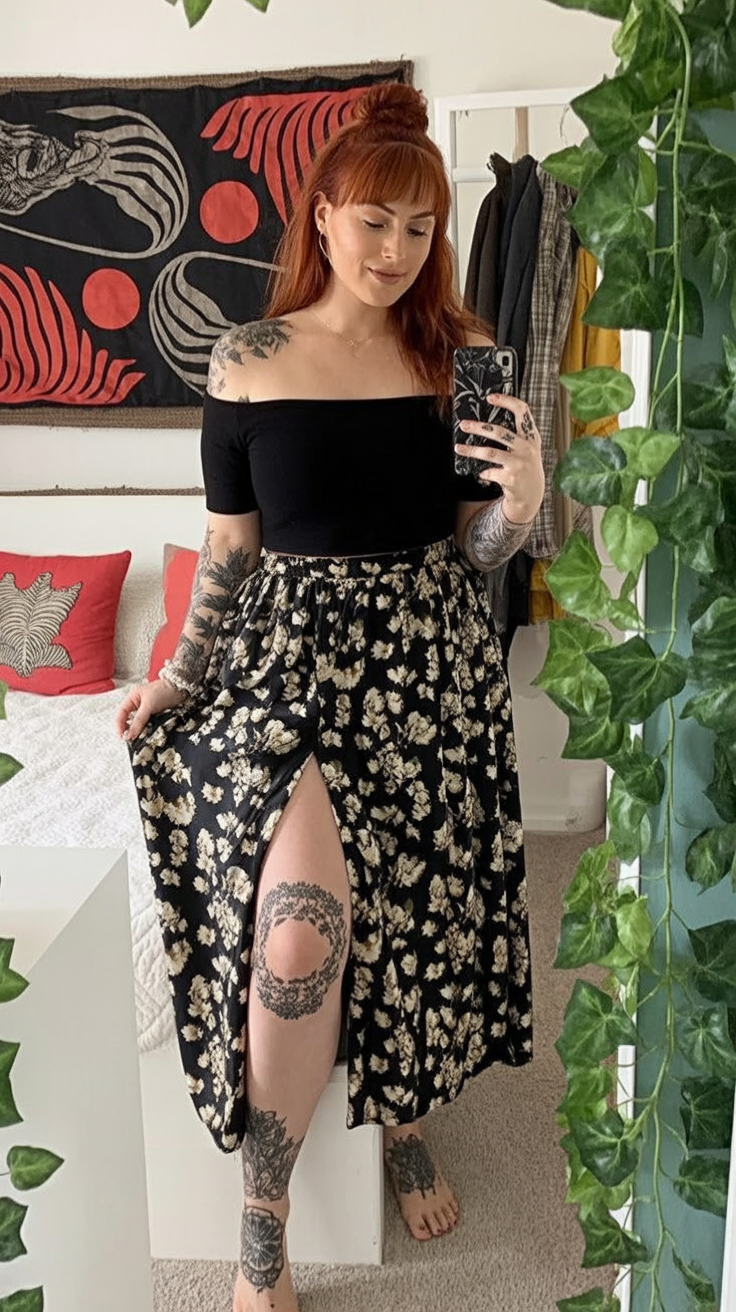 This outfit is really what rock and roll means to me—it’s romantic, it’s almost mysterious, and it completely owns its bit of naughtiness. The off-the-shoulder shirt hugs your collarbones and tattoos, and then paired with this floral split skirt that goes high up your thigh, you get enough interest to keep it exciting without overdoing it. This is what you can rock to date at your local small bar on a cold fall evening, or then what you can stick with if you’re wanting to show your figure but stay modest everywhere except for this one fun peek at your legs.