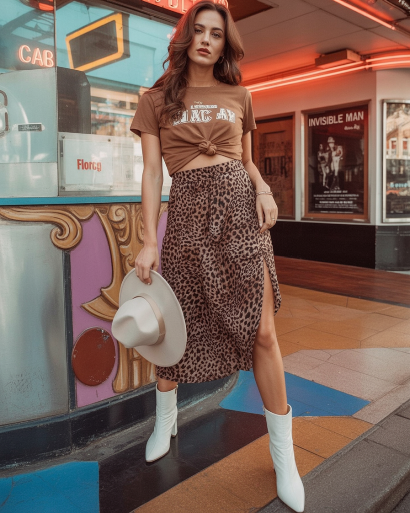 This outfit is all about achieving that laid-back-cool, not-too-serious-at-all attitude, which makes it perfect if you’re one of those fashionistas with your finger right on that pulse. The knotted brown shirt keeps things laid-back and relaxed, and then paired with leopard and white boots, you’ve created something properly stylish. This is one of those Casual Clothing 2026 combinations you can rock at either a movie date, at an event, or maybe running down to downtown with your friends.