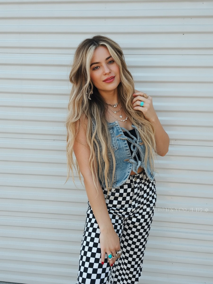 6. Denim Vest With Checker Pants And Turquoise Jewelry