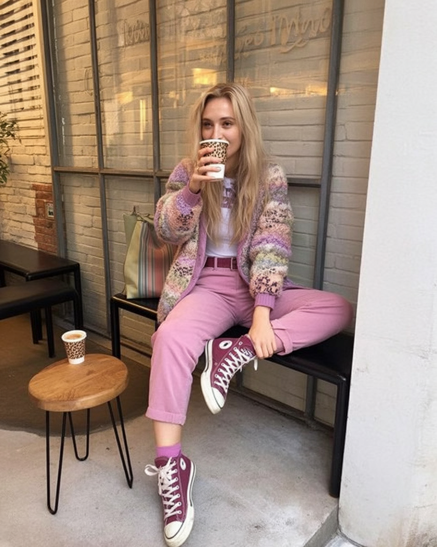 13. Pastel Pink Denim And Cozy Cardigan With High-Tops