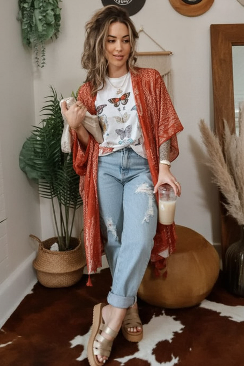 This outfit symbolizes your ultimate weekend thrift store adventure with your favorite folks, topped with chilled iced lattes in your favorite mug. The butterfly tee spells cute and playful and is mixed with rusty hues of the kimono, which flows with each step you take. Boyfriend jeans with ripped details keep all of you so laid-back and authentic, making you feel anything but high-end and perfect. This comfortable, easy-going outfit is one of those trends of 2026 you can easily revert to on lazy summer mornings and feel yourself in, but with an extra dose of artistry.