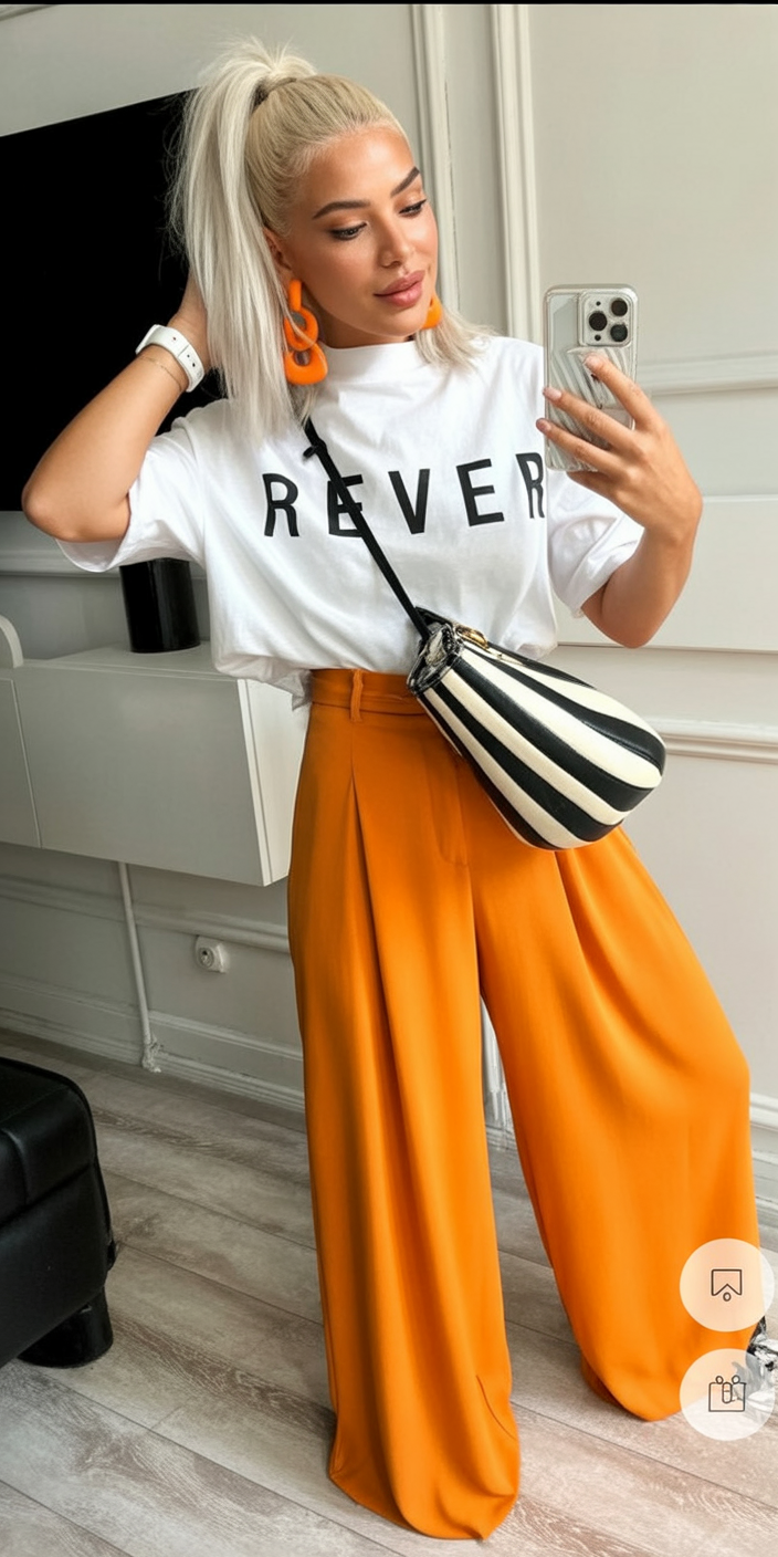 This style represents what happens when Casual Outfits 2026 has decided they are tired of playing it small. The first things you notice about this style are its bright and cheerful tangerine-colored trousers, and that’s not an overstatement; they really are like an energy boost and mood lifter all at once. The white graphic tee, however, balances all of this out with its laid-back, oversized style, and generally, this whole outfit has such an easy, playful energy that you’d think it was somehow created by default, not by actual fashion design—though, of course, you’d be mistaken.