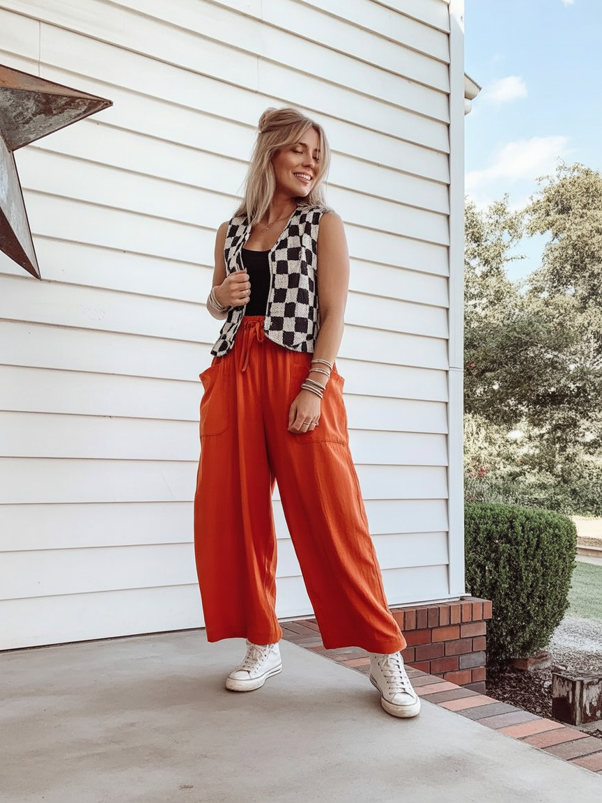There’s so much relaxed happiness found within this outfit, like weekend happiness trapped within your clothes. The orange pants hang loose at your ankles, and then there’s your checkerboard vest, giving your outfit all the fun and playful flair with serious retro vibes, not mass-produced as costume clothes. This outfit is one of those casual outfits of 2026 that you can easily sport at summer events, backyard parties, or even just while wandering around your city, and it’s also one of those casual outfits of 2026 that readers can effortlessly come up with themselves!
