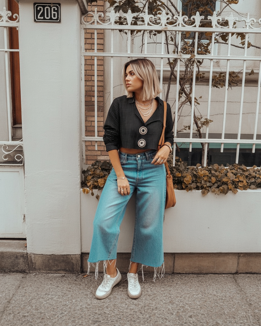 This is one of those “I didn’t even bother, but really, my personal style is this awesome anytime”-type outfits. The slightly cropped black shirt with oversized buttons is totally elegant, and paired with wide, frayed-hem jeans, you get that laid-back style perfect for Casual Outfit 2026. And with white sneakers and a tan cross-body, you’ve got all the right notes of modern and vintage, as if you’re walking through city streets on an autumn afternoon.