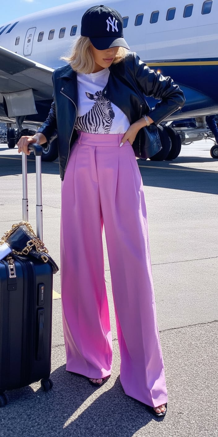 5. Airport-Ready Pink Trousers And Leather Jacket