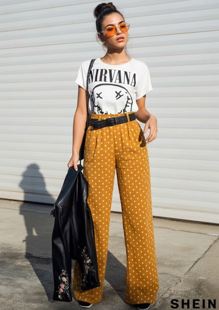 This look is pure attitude in the best, most wearable way. The vintage-style band tee instantly adds edge, while the mustard polka-dot trousers keep things playful and bright. Tossing the leather jacket over one arm makes it feel like you’re always on the move, ready for a gig, a drink with friends, or a casual workday in a creative office. It’s a great example of Casual Outfits 2026 mixing nostalgia with fresh color.