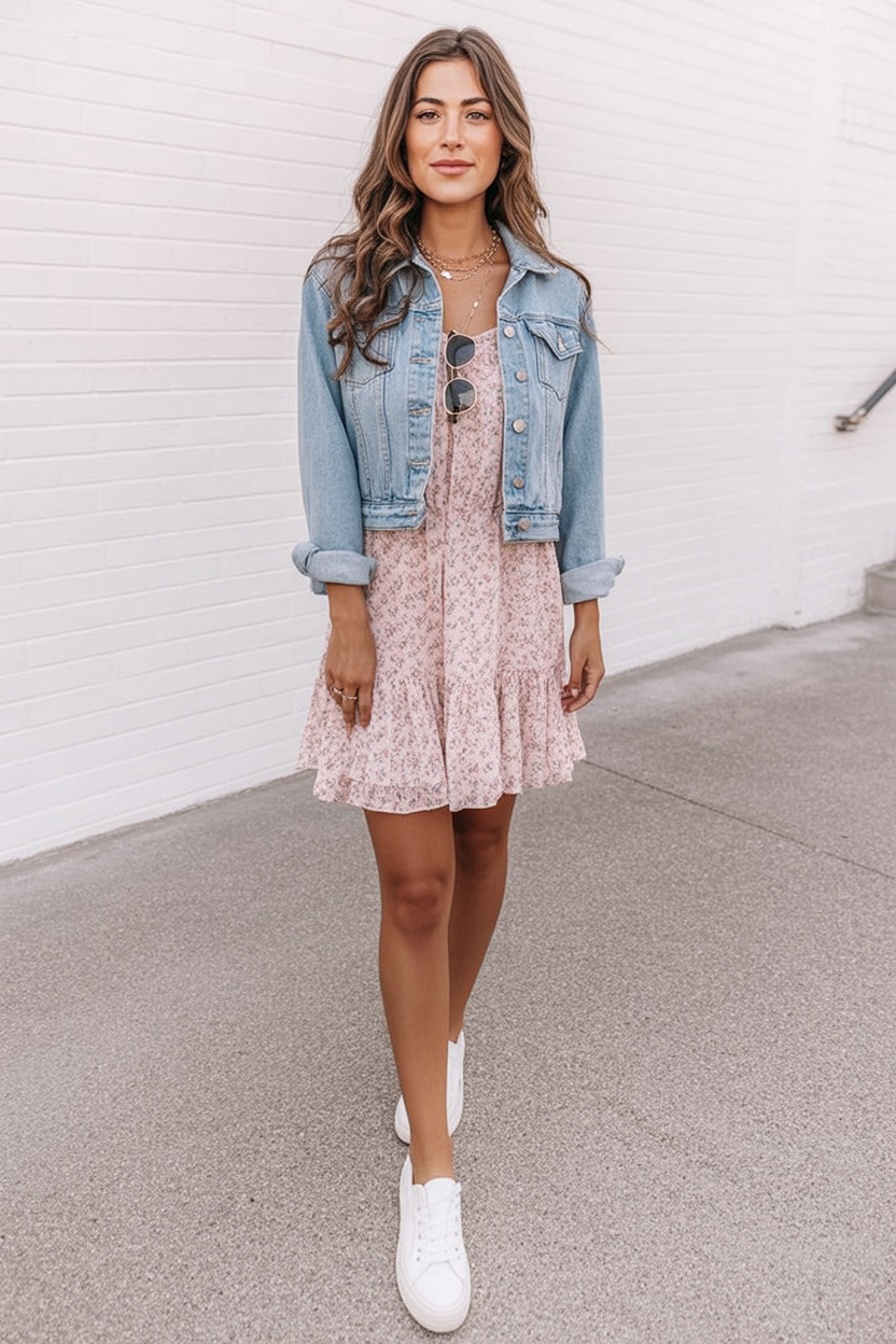 20. Floral Mini Dress With Denim Jacket And White Sneakers