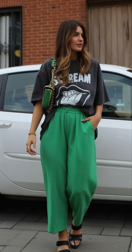 This outfit is very easy to move around in. The oversized charcoal graphic tee has that sleazy, rock band concert-worn fashion, and emerald green pants provide one phenomenal color statement that works surprisingly well as a neutral option. Paired with a matching bag and black slippers, all of these come together quite well to make fashion statements, not something unworryingly slung together. This is what party fashion for women, as defined under Casual Outfits 2026, really means—something not so serious and slightly rebellious, with fashion. The beauty of this outfit, however, lies in its minimalism. The elastic-waist pants mean there’s no digging waistband after long hours, and the loose-fitting tee hides sins from last night’s dinner parties and today’s school drop-offs. You can even get away with washing and re-wearing this entire ensemble without needing to treat it with TLC, and it pairs with sneakers as easily as it does with sandals. Layer with your favorite trench coat as fall kicks into high gear, and you’ve got an entire ensemble that’s not only hip but also ridiculously comfortable.