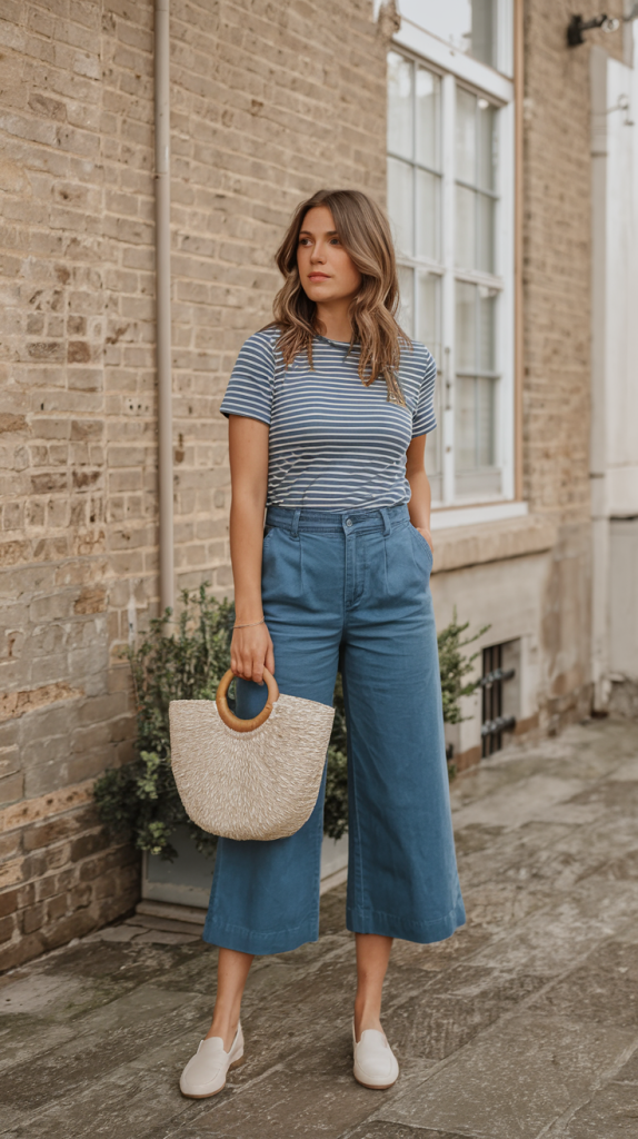 This outfit hits a sweet spot between relaxed and refined. A slim striped tee tucked into cropped wide-leg trousers in chambray blue offers a chic, grounded look that’s perfect for work, especially for creative roles. It’s a smart choice for women looking to feel dressed up without breaking a sweat.