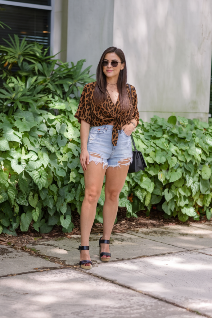 Animal prints continue to dominate in 2025, and this outfit delivers. A cropped leopard blouse with a front tie adds a fierce, confident flair to classic ripped denim shorts. Ideal for rooftop drinks, live music nights, or girls’ weekend getaways, this look embraces bold patterns while keeping the silhouette simple.