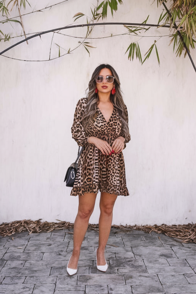 A leopard-print mini dress with long sleeves and a deep V-neck makes an instant statement. The cinched waist and flared skirt offer shape without sacrificing comfy movement—ideal for women wanting an eye-catching outfit for a summer party or even Christmas in July celebration.