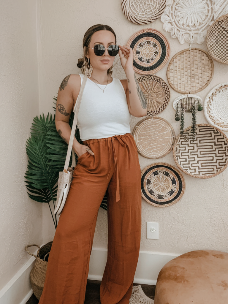 This look is for the modern boho lover. A crisp white racerback tank tucked into rust-colored wide-leg pants delivers instant ease with just the right amount of effort. The linen-like texture and drawstring waist make this a breathable, chic choice for women wanting to keep things breezy in hot weather.