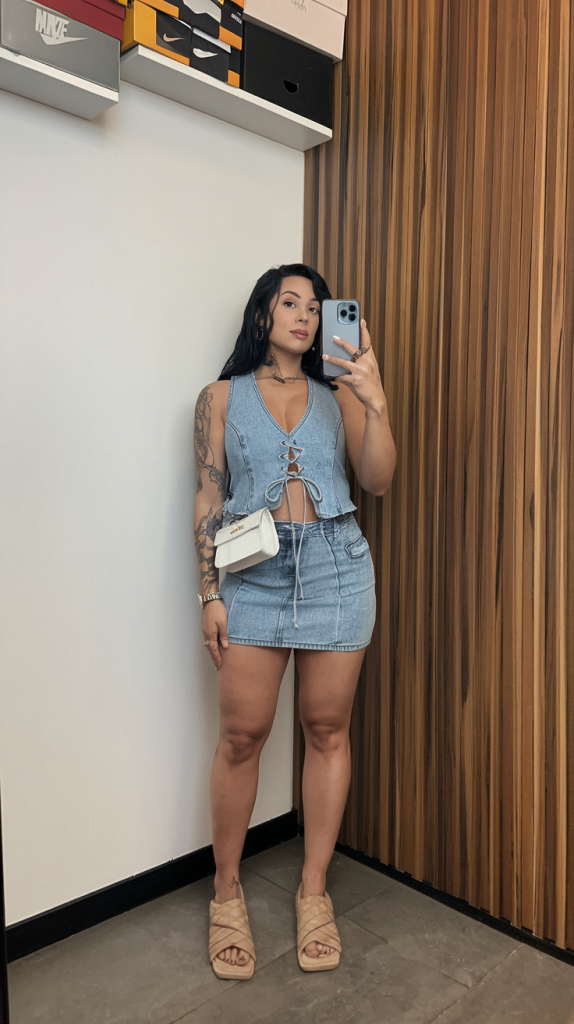 Channel your inner ‘90s supermodel with this fitted denim vest and matching denim skirt combo. What makes this two-piece set so on point for 2025 is the attention to cut and fit: cinched at the waist with lace-up details, the top shapes the torso beautifully, while the mini skirt stays youthful and streamlined.