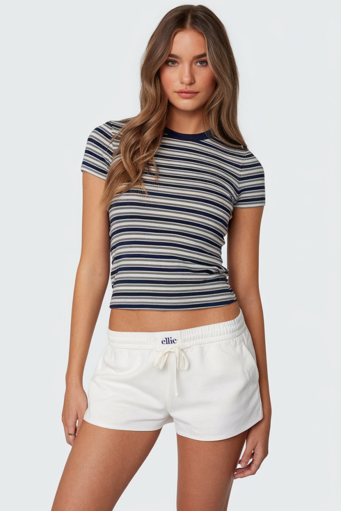 A navy-and-white striped ribbed tee tucked into relaxed white drawstring shorts brings back everything we love about laid-back summers. The fit is casual without being sloppy—something a lot of women over 50 or plus size shoppers look for in breathable cotton options that don’t sacrifice style.