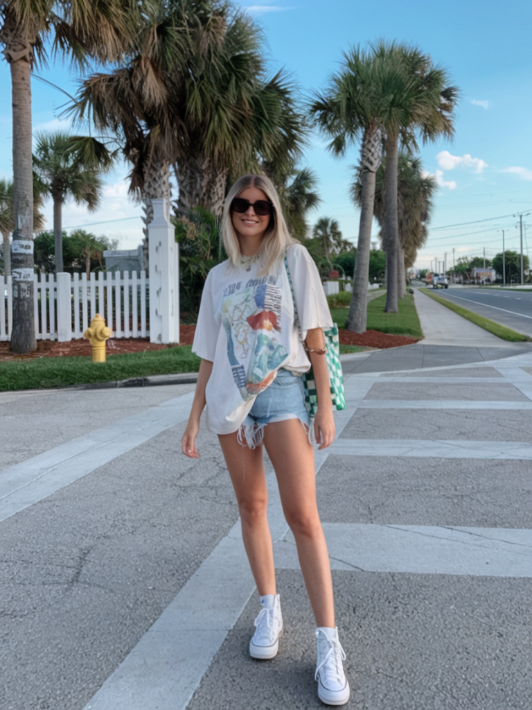 If Gen Z and millennial fashion had a baby, it would be this. A graphic oversized tee, high-waisted denim cut-offs, and classic white high-top sneakers is your perfect “I just threw this on” look for travel or festivals. The oversized fit keeps it comfy, and the casual charm of this look is super approachable and repeatable.