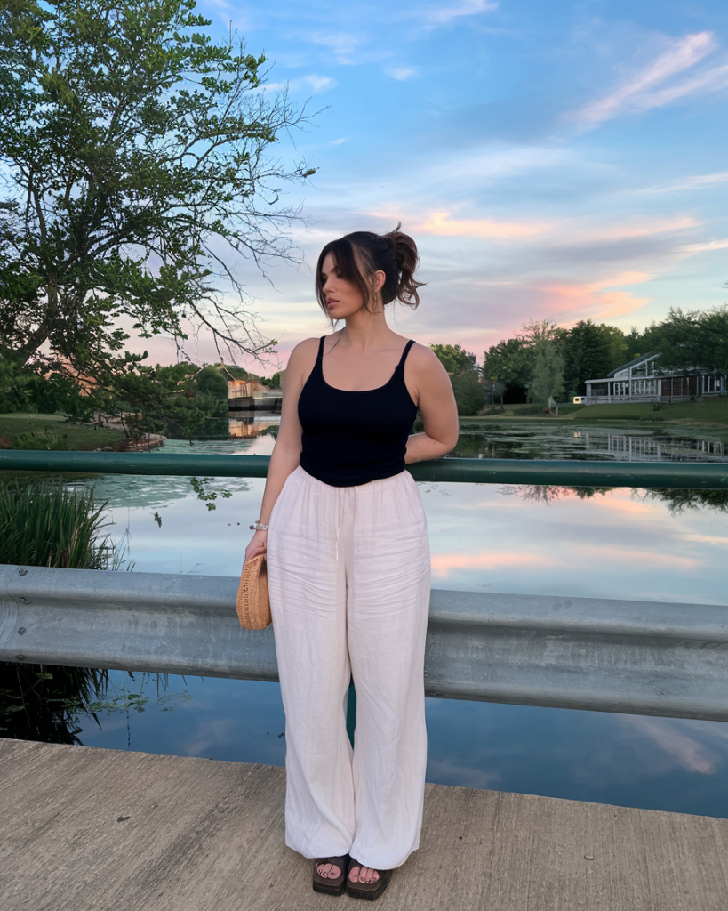 A black tank top paired with breezy, wide-leg linen trousers creates the ultimate warm-weather evening look. The flowy silhouette is incredibly flattering for plus size, midsize, and tall women, and the fabric choice offers the breathability needed for humid summer nights.