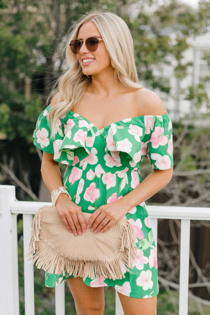 Bold florals are always in for summer, but this off-the-shoulder green dress with pink blooms and ruffled details makes a strong case for standing out in 2025. It’s equal parts tropical and aesthetic, ideal for women attending daytime wedding events, baby showers, or a vacation party where you want to feel a bit extra. The off-the-shoulder cut is especially flattering for broader shoulders or curvier figures.