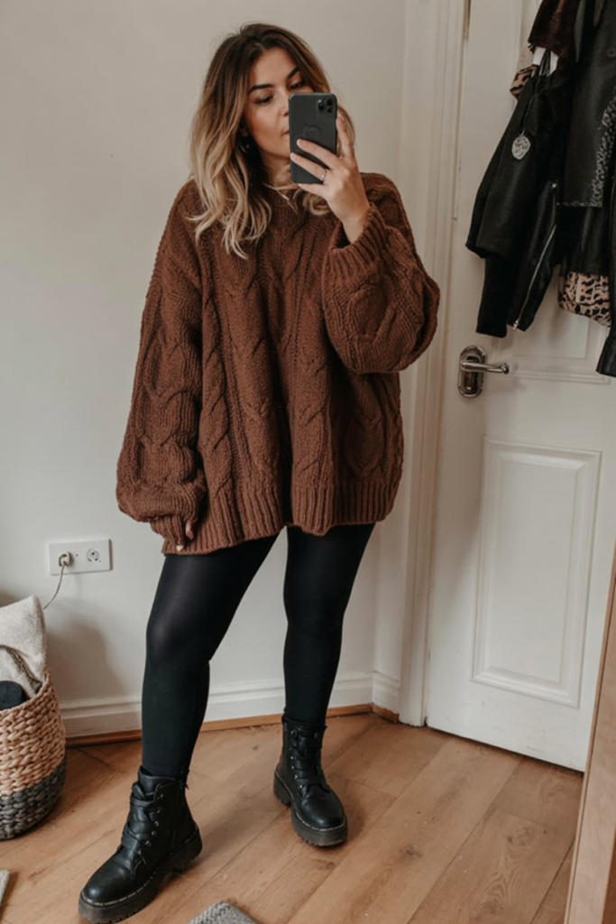 6. Oversized Brown Knit with Black Leggings