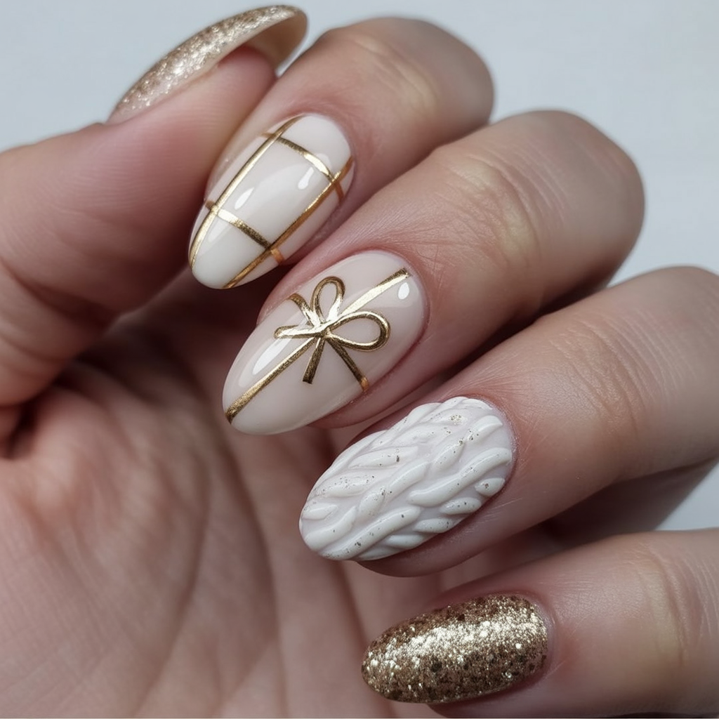 Tiny little nails resembling presents: what gift of cheer would one be more festive with? Golden line accents, bow details, and sweater-texture nails combine to create a cheerful yet chic holiday vibe. Glitter accents in gold hues make an opulent statement thatn’t shy away from celebrating.