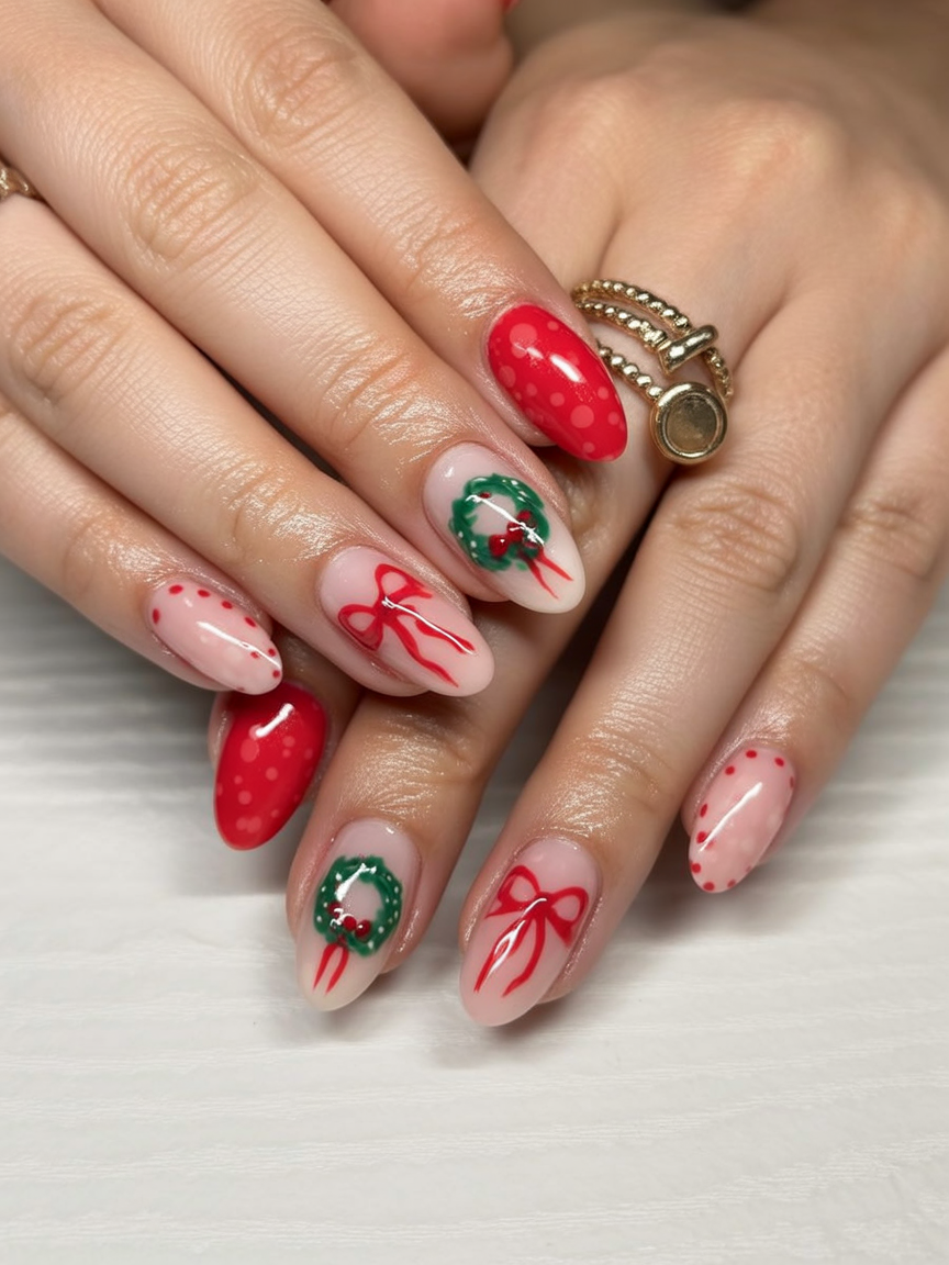 These nails look like bringing a Christmas card to life: red bows, green wreaths, and playful dots that instantly summon holiday joy. The soft pink base keeps the bold red and green accents cute and yet elegant. It’s cheerful, feminine, and feels just like unwrapping a present every time you look at your hands.