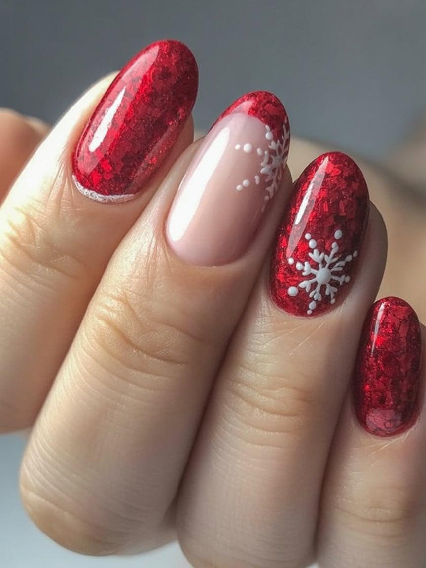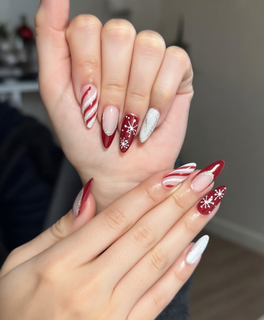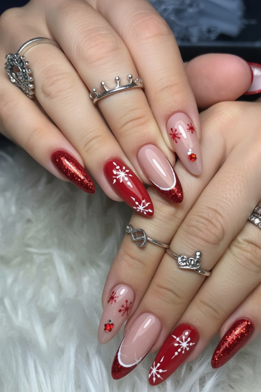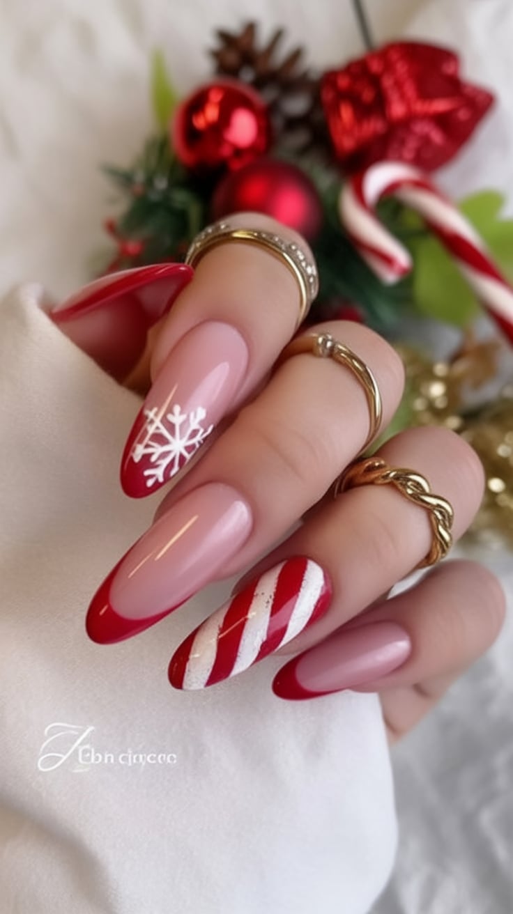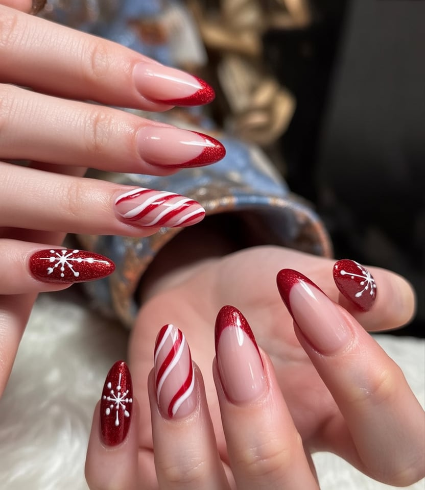 There is just something about this classic red and white almond design that immediately resonates with a warm holiday-type hug. The candy stripes give it a fun kind of sweetness, and the bold glittery red tips sparkle and shine like those Christmas-tree ornaments. When you add snowflake art in there, you get a manicure that walks just right that line between festive and polished: tradition meets a little fun.