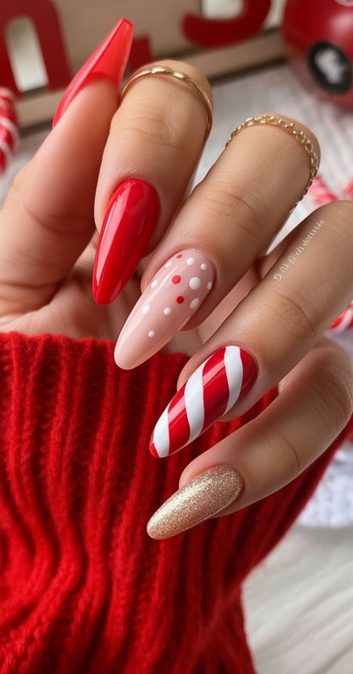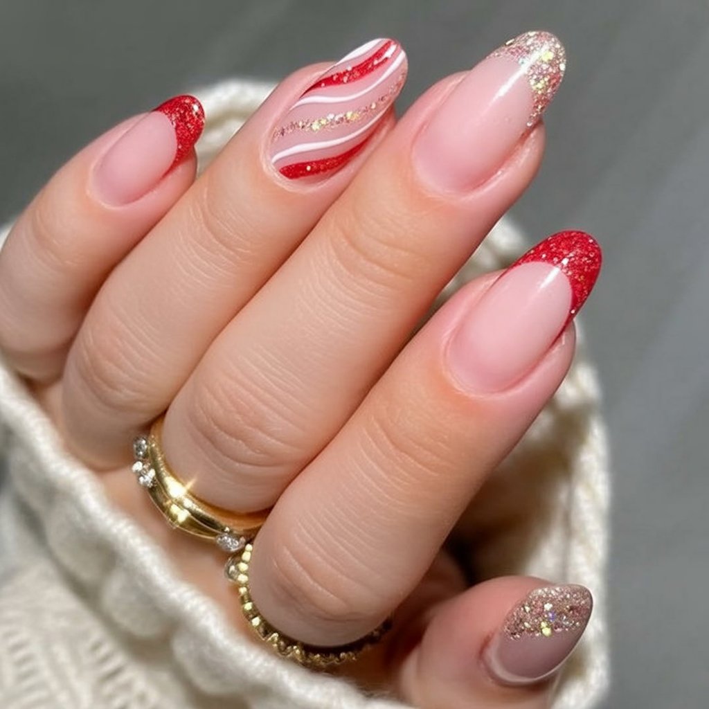 Playful, sparkly, and downright delicious-looking, these candy cane swirl nails are made for holiday fun. The mix of red glitter, gold shimmer, and soft pink bases gives them a festive yet lighthearted personality. They’re the kind of nails that instantly make you smile — perfect for Christmas parties or cookie-baking weekends.