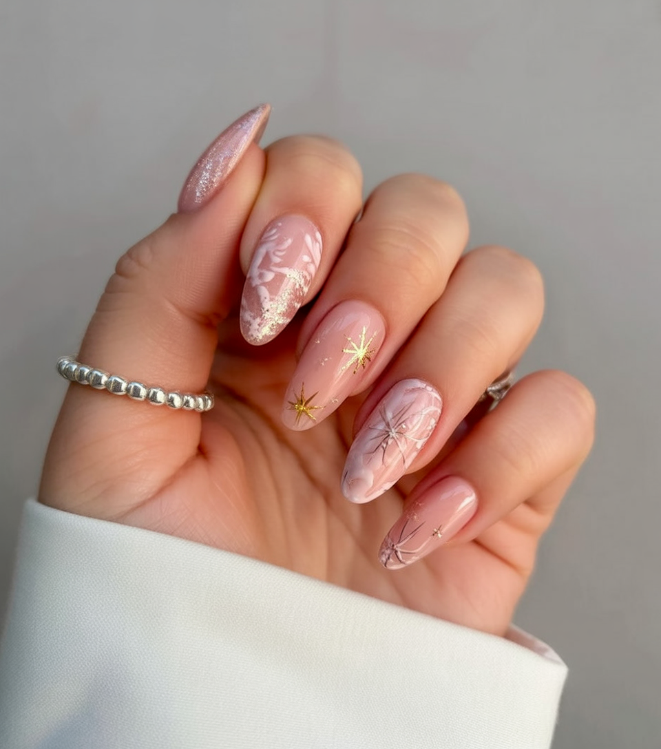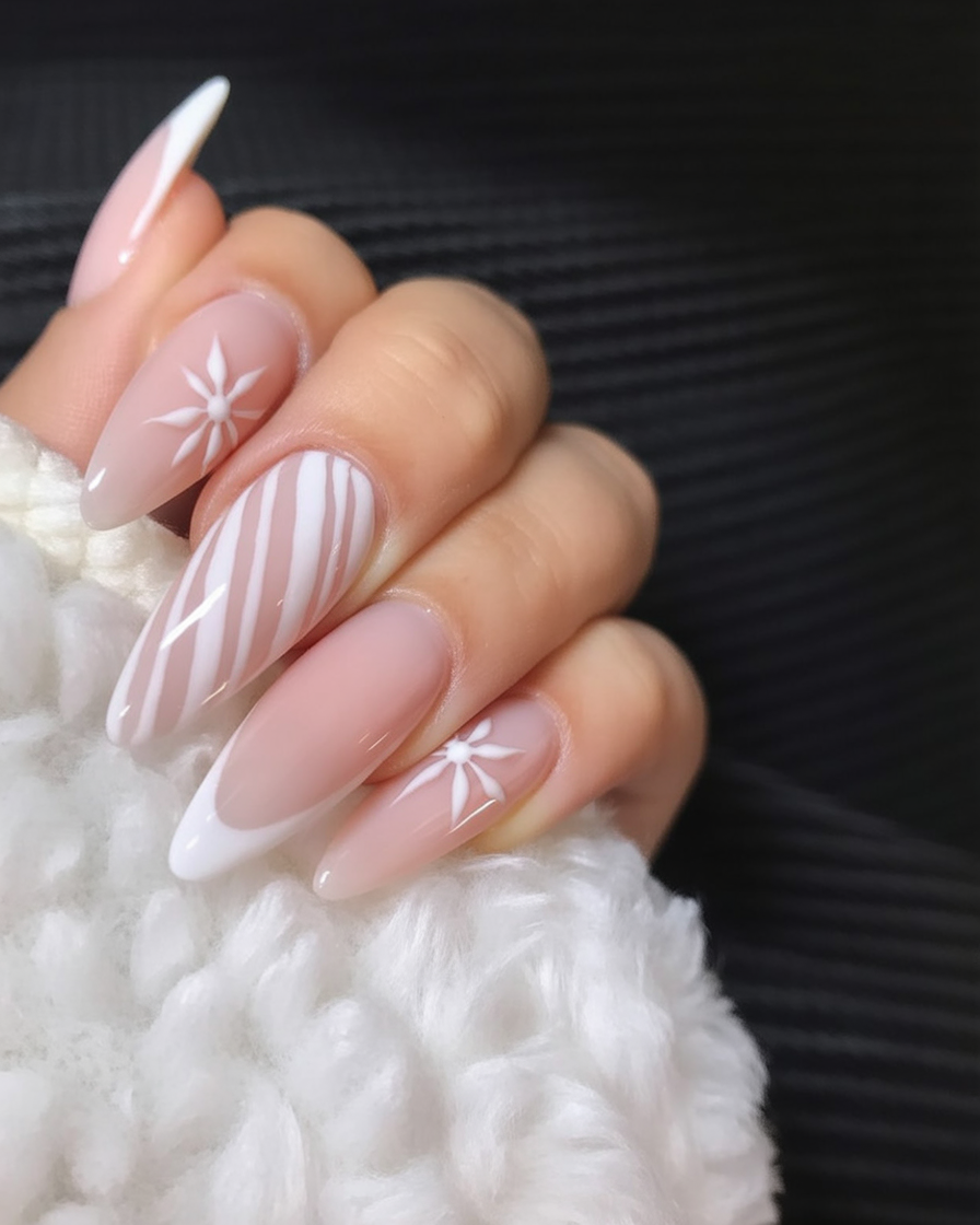 Minimalist and yet festive, the nails feature clean white stripes and starbursts on a nude base. But they are subtle enough; seasonal, however, like the snow settled suddenly. The white french tips give everything a neat and elegant finish.