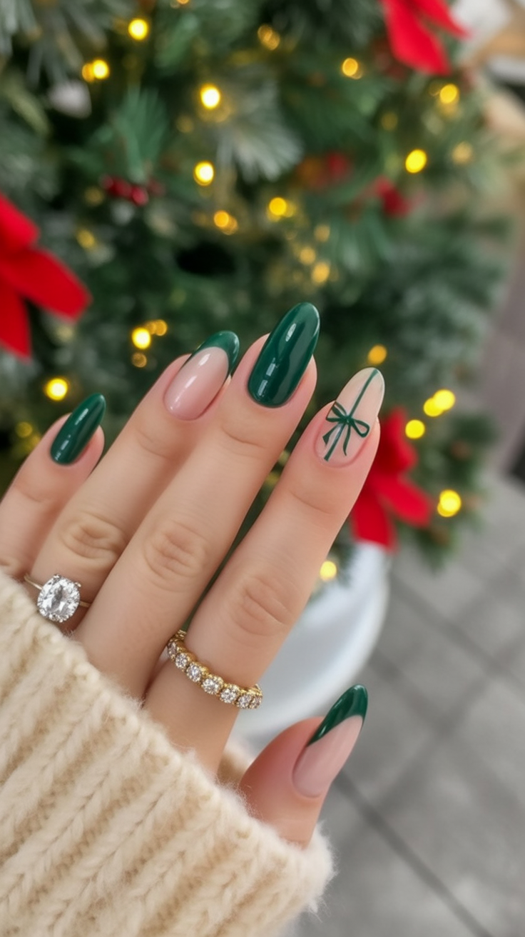 Gift wrapping with a lush green ribbon, depending on which way the winds are blowing, could only be said to be one of very few such beautiful things, and the whole spirit of this nail pattern rests on that one thought. Its glossy greens contrasted against muted nude bases strike a chic note of balance, while the faintest bow detail lends an almost invisible wink toward Christmas morning. Preppy and polished, yet also rather sophisticated — as if carrying a whisper of holiday spirit wherever you go.