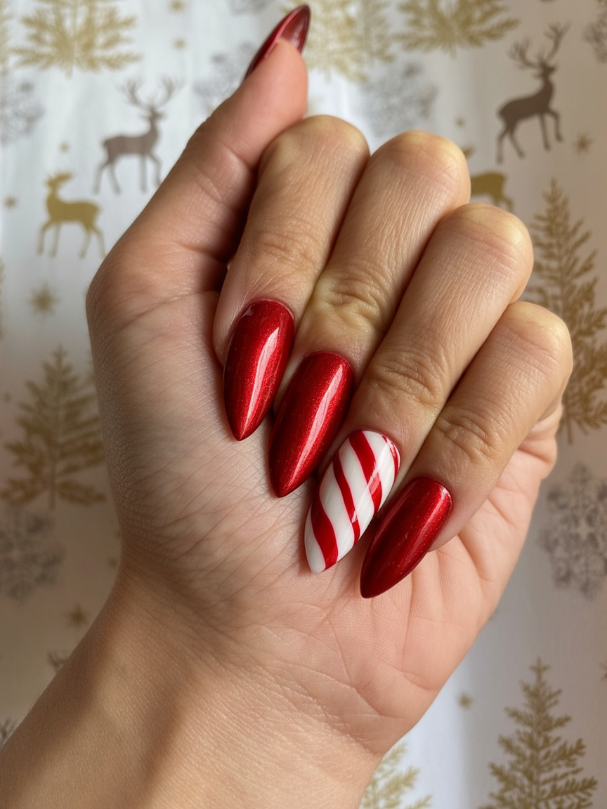 Sometimes the simplest looks are the most striking, and these nails are prime examples of that. The glossy red almond nails with a single candy cane accent nail feel classic and festive. It is the kind of manicure that quietly commands attention, so to speak, in the presence of loud and funky ones; classic is always the way to go.